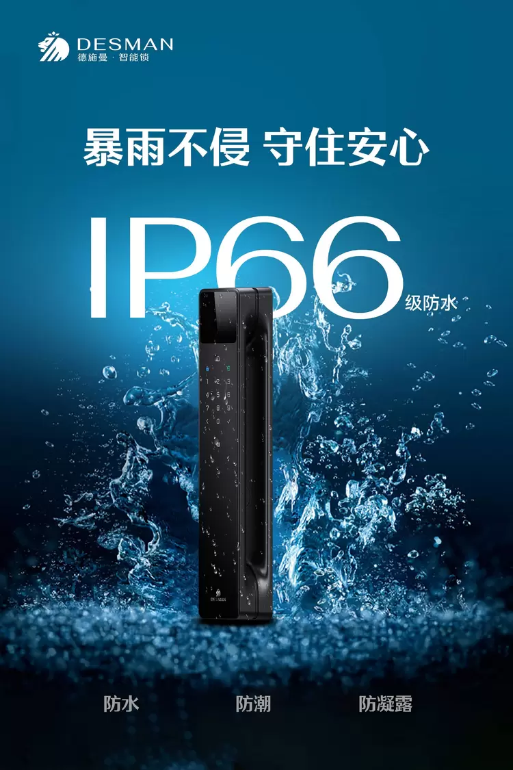 当前,智能锁行业国标对于产品防水的要求是IP52级别,仅能防住垂直或倾斜15°的水滴,面对暴雨天、南方回南天、北方冷凝水等特殊场景,用户常常面临锁具故障,无法进门的尴尬时刻。对此,德施曼全新发布IP66级别防水技术,打造多重防水体系,从物理隔绝到分子防御,通过外部一体密合结构设计达到暴雨不侵,通过内部电路板UV三防护甲以及类荷叶纳米疏水涂层的结合使用,实现超强疏水隔离拒水,风雨无畏,返潮不愁。