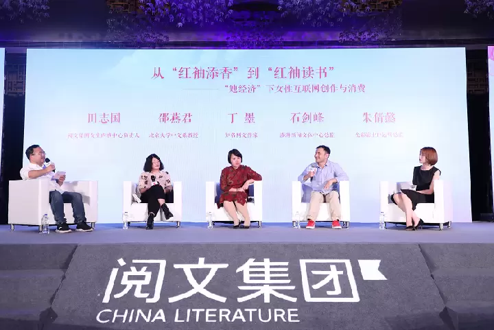 图:圆桌论坛,左起:阅文集团女生内容中心负责人田志国、北京大学中文系教授邵燕君、知名网文作家丁墨、澎湃新闻文体中心总监石剑峰、光彩影业IP运营总监朱倩懿