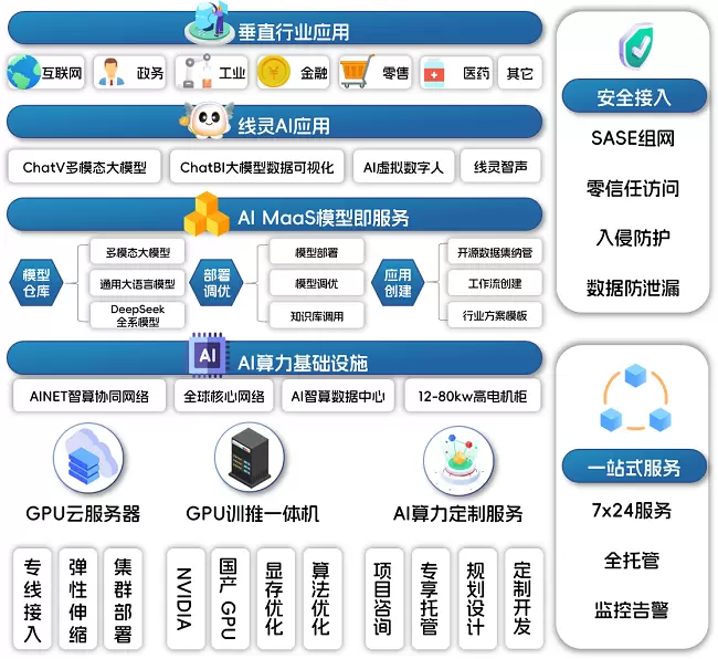 企业互联升级:通过“SDN+AI+DevOps”技术,对传统 VPN/SD-WAN 网络进行智能化改造,并配备 AI 算力专线,为企业访问私域 AI 应用提供安全高效的网络通道,满足算力调度与模型访问需求。