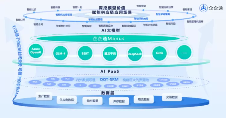 企企通整合了DeepSeek、BERT、通义千问、Llama3等众多主流大模型,与其他第三方工具进行无缝集成,打造了基于供应链封闭业务场景下的专有Manus,将语义识别、任务执行与系统联动能力紧密结合,形成“AI+供应链”智能协同生态,赋能企业提升供应链效率,降低采购成本,智能化采购流程,实现AI供应链数智化转型升级。