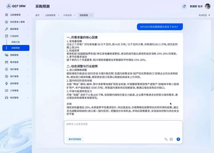 能够接收文字、图像、语音、文件等多种模态信息,并结合语义建模深度解析采购人员的真实业务意图。例如,当用户表达“我想了解采购预测增加的原因”,AI Agent能够快速识别信息需求,自动匹配相关数据源,并生成下一步分析任务。