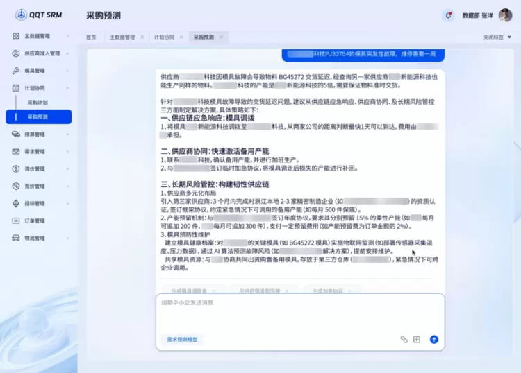 例如,当用户反馈“A供应商B模具突发性故障,维修需要一周”时,AI Agent将自动识别交付风险,执行应急采购预案(如生成模具调拨单、联络替代供应商、生成加急协议等),把一个复杂任务,拆分成具体的执行步骤,驱动SRM为企业构建‘千企千面’的SaaS流程,并同步提供长期风险管理建议。