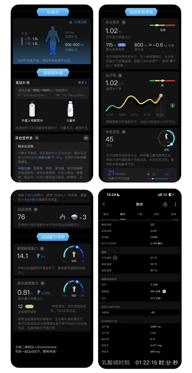 水合状态追踪:每分钟刷新身体脱水量,结合环境温湿度,智能调整补水节奏,突破“撞墙期”;