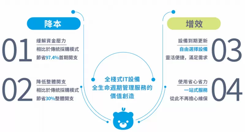 具体来说,该模式针对企业在IT设备采购、运维、管理及淘汰处置中的痛点,包括一次性采购设备的资金压力、技术支持响应缓慢、设备管理灵活性不足以及设备利用率低等问题,提供了系统性解决方案。通过这一模式,企业能够显著降低数字化转型的门槛,从有效降低运营成本,提升业务运营效率,为其持续高质量发展注⼊强劲动力。