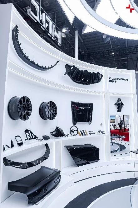 凭借其高辨识度的纹理以及在F1赛车、超级跑车等顶级性能车型上的广泛应用,碳纤维复合材料已成为高端工业设计的标志性元素之一。在“酷炫美学”展区,HRC汇聚了多款兼具视觉张力与美学享受的汽车内外饰件等类型产品,通过流动的线条与轻盈的质感完美展现了高端制造与设计美学的完美融合。