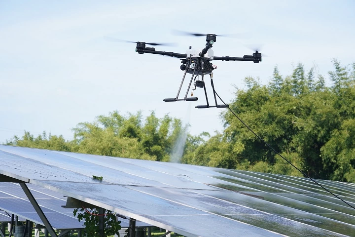 “D15R的摆动式喷头设计是行业首创。”九思智能技术总监表示,该设计通过0-45°广角摆动,配合多角度喷嘴,可精准清洗光伏板,实现“无死角清洗”。此外,飞行平台采用轻量化碳纤维机身,抗风等级达6级,恶劣天气下仍可稳定作业。