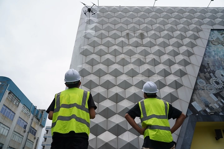 九思智能D15R无人机以“立面航线+高压清洗”为核心技术,通过双RTK精准定位、毫米波雷达实时测距,实现“地面站一键操控+全自动清洗”。其模块化设计可适配固定式、摆动式两种清洗挂载,配合4种角度喷嘴,满足玻璃幕墙、石材外墙、光伏板等多场景需求。深圳某68.4米高端大厦案例显示,D15R仅用传统作业1/3时间完成清洗,成功替代了“蜘蛛人”,同时降低人工成本,安全性提升至降低风险作业。