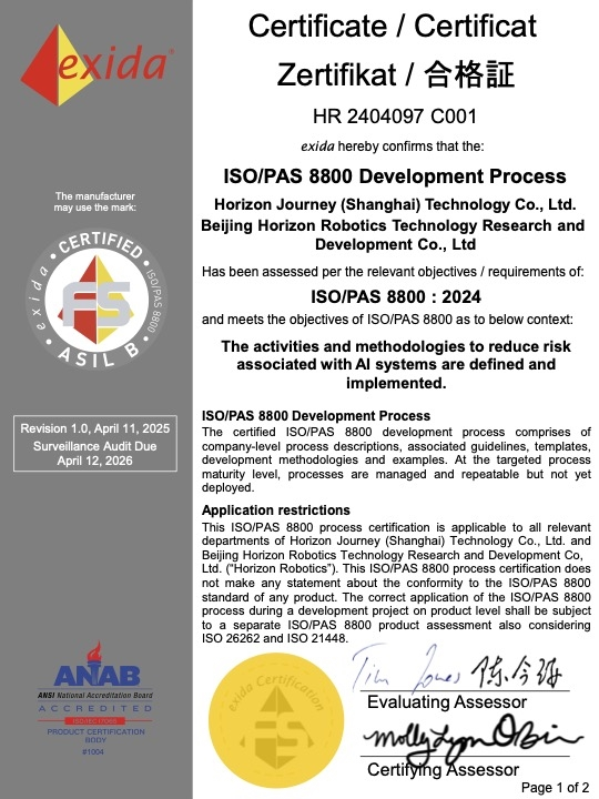 这份来自国际权威机构的认证,为地平线构建了通向全球市场的"安全信任护照",同时标志着地平线已构建起符合国际最高道路车辆AI安全标准的产品开发体系,能够充分满足OEM和Tier1的相关安全需求。