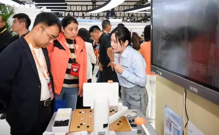 来自青岛的何先生坐在棋盘前,眼神专注地盯着棋盘,与围棋机器人展开了激烈对决。每落一子,他都深思熟虑,而围棋机器人则以稳定且快速地运算,迅速回应。观棋人士时而为精彩的棋局叫好,时而对围棋机器人的决策惊叹。