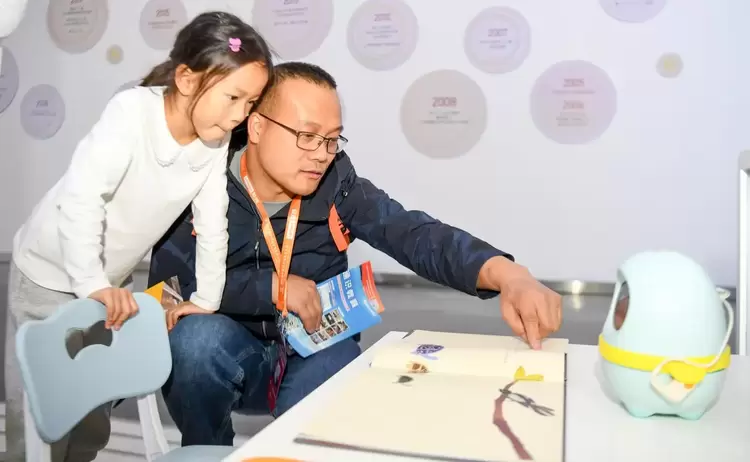 展区内,5岁的方晴(化名)把绘本放在机器人面前,机器人识别封面后,就开始陪着她读绘本。孩子翻到哪页,它就讲到哪页,它地讲解并非照本宣科,而是带有引导和讲解,并会时不时和孩子互动。