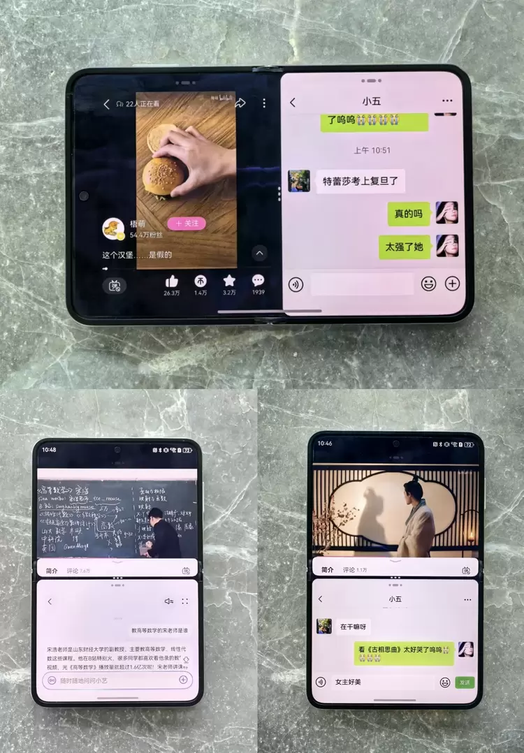 多样分屏方式,满足各类场景:Pura X内屏多任务并行时,可以有上下、左右两种分屏模式。左侧刷短视频点赞,右侧回微信消息;上半屏看B站教程,下半屏记录笔记。无论是学生党边上网课边查资料,还是职场人边开会边整理纪要,都能轻松应对。
