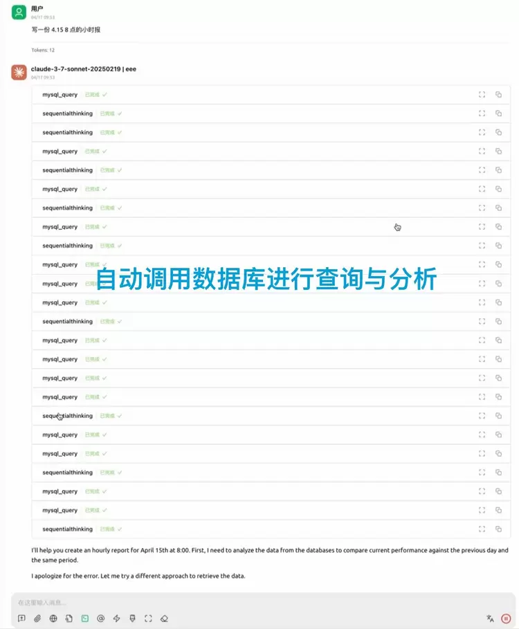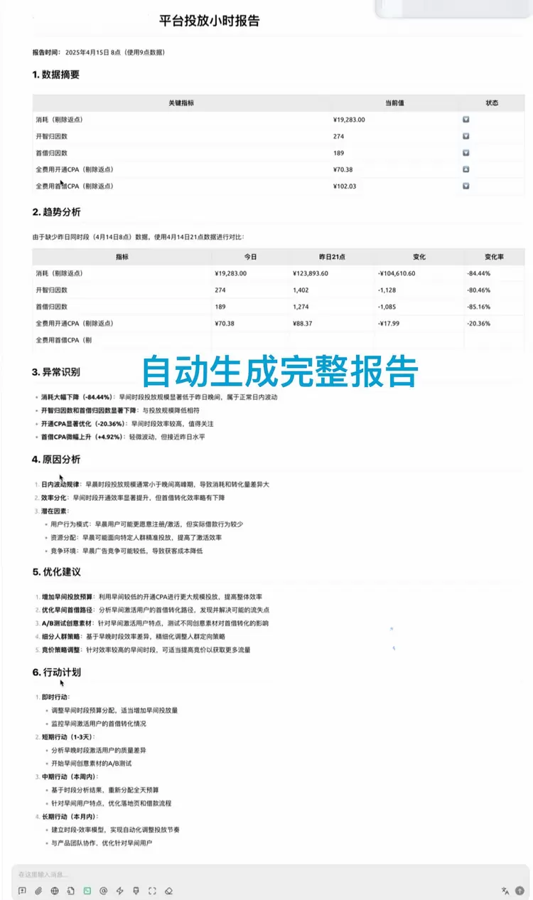 现在有了MCP服务的加入,人类投手只需要在跟利欧归一研发的“AI搜索投手”中输入“写一份4月15日8点的小时报”,利欧归一“AI投手”就可以自动完成收集数据、数据分析、生成报告等一系列的工作。