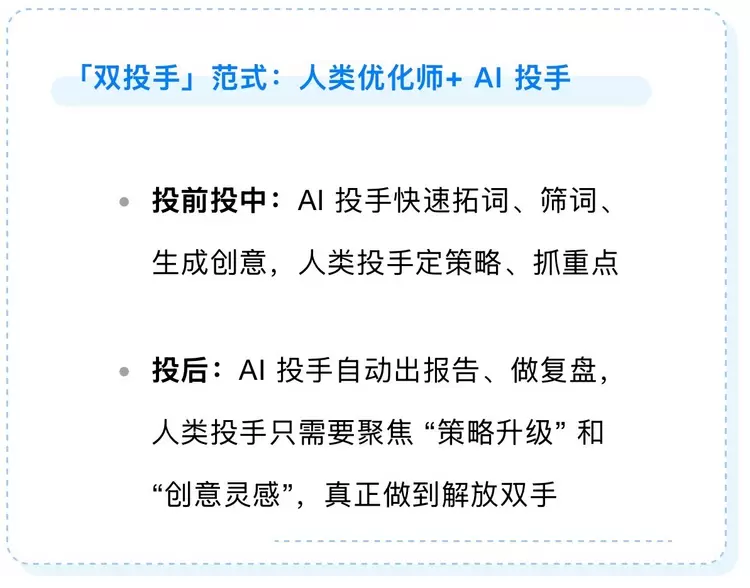 在利欧数字的MCP服务发布前,归一智能提出的“双投手范式”已经通过将部分标准工作流交给AI来做的方式,在一定程度上提升了广告投放效率。但那时的利欧归一“AI投手”,更像是人类投手的“小助理”,只能执行预设的单一任务,缺乏真正与人类投手深度协同的能力。但利欧数字MCP服务的发布,让利欧归一“AI投手”具备了更强的行动力,在企业生产力体系中锁定更具影响力的一席,把企业带向AI NATIVE的「人机共生」经营态。