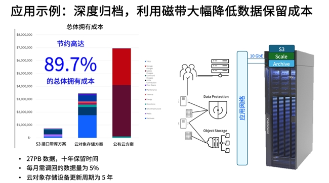 通过IBM 软件定义存储技术,IBM 磁带库可以提供 S3 接口,让企业可以使用对象存储或者公有云存储一样的方式实现数据归档。磁带的大容量、低成本等优势,可以大幅降低PB级别数据的长期保留成本。例如,采用 IBM Diamondback 的深度归档方案,27PB数据的10年保留成本比公有云存储降低近90%。
