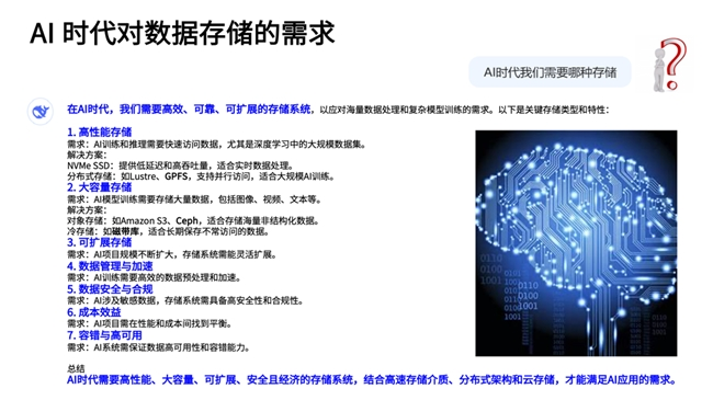 当我们问DeepSeek “AI时代需要哪种存储”,它给出了如下答案: