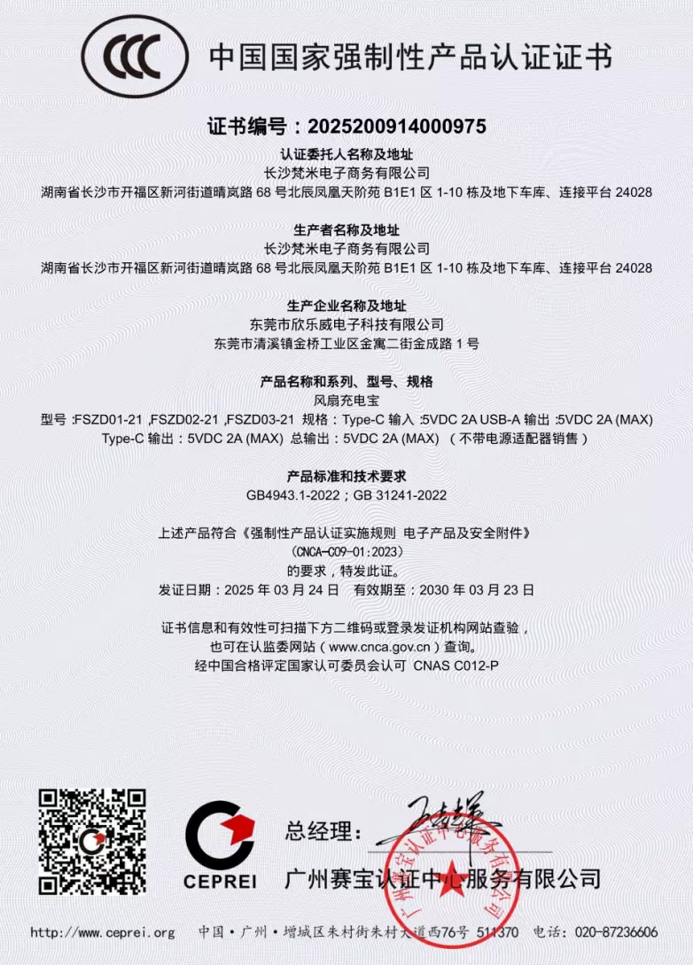 特别说明:2024年12月1日前出厂的产品(型号FSZD02-21)虽通过CE,ROHS,FCC,PSE等欧美国际认证且产品性能满足CCC要求,但为满足新规CCC证书要求,为客户提供更高品质的产品。2025年3月24后生产的产品均已同步获得CCC双认证。除此之外,还有新国标关于小风扇国标的检测报告和产品续航测试报告,续航可达50多个小时。
