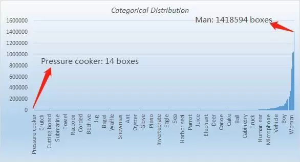 数据分布不均衡:最少的类别框选只有 14 个,而最多的类别框选超过了 140w,数据分布严重不均衡。