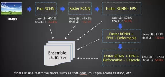 在比赛过程中,百度视觉团队采用了不同复杂度、不同框架网络进行模型的训练,并对这些模型进行融合。从整体方案框架来看,可分为 Fast R-CNN 和 Faster R-CNN 两种不同的训练模式。Fast R-CNN 版本是百度视觉团队研发的一套 PaddlePaddle 版本,在此基础上 Faster R-CNN 加入了 FPN、Deformable、Cascade 等最新的检测算法,模型性能实现了大幅度的提升。