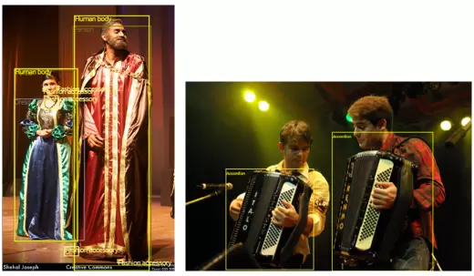 尺度变化大:大部分物体框只占整个图片的 0.1 以下,而有些框选却占了整个图片区域。如图所示,Open Image V4 集合存在更多的小物体,参赛者也会在检测数据中遇到更大的挑战。