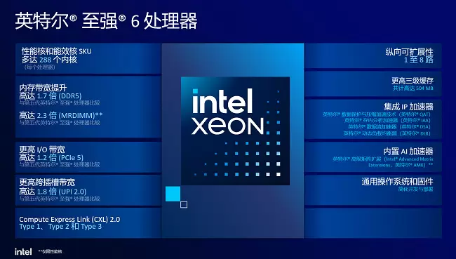 性能核(P-Core)专为AI、浮点运算及事务型数据库等计算密集型场景设计,通过单路最高128核与504MB三级缓存实现低时延数据访问,同时搭载DDR5 MRDIMM内存技术,与DDR5 6,400 RDIMM相比带宽提升37%至8,800 MT/s,并集成AVX-512指令集加速矢量运算,AMX指令集加速多精度(INT8/BF16/FP16)矩阵运算,支持单路高能效配置(高达136条PCIe通道),显著降低服务器整合的总体成本(TCO)。