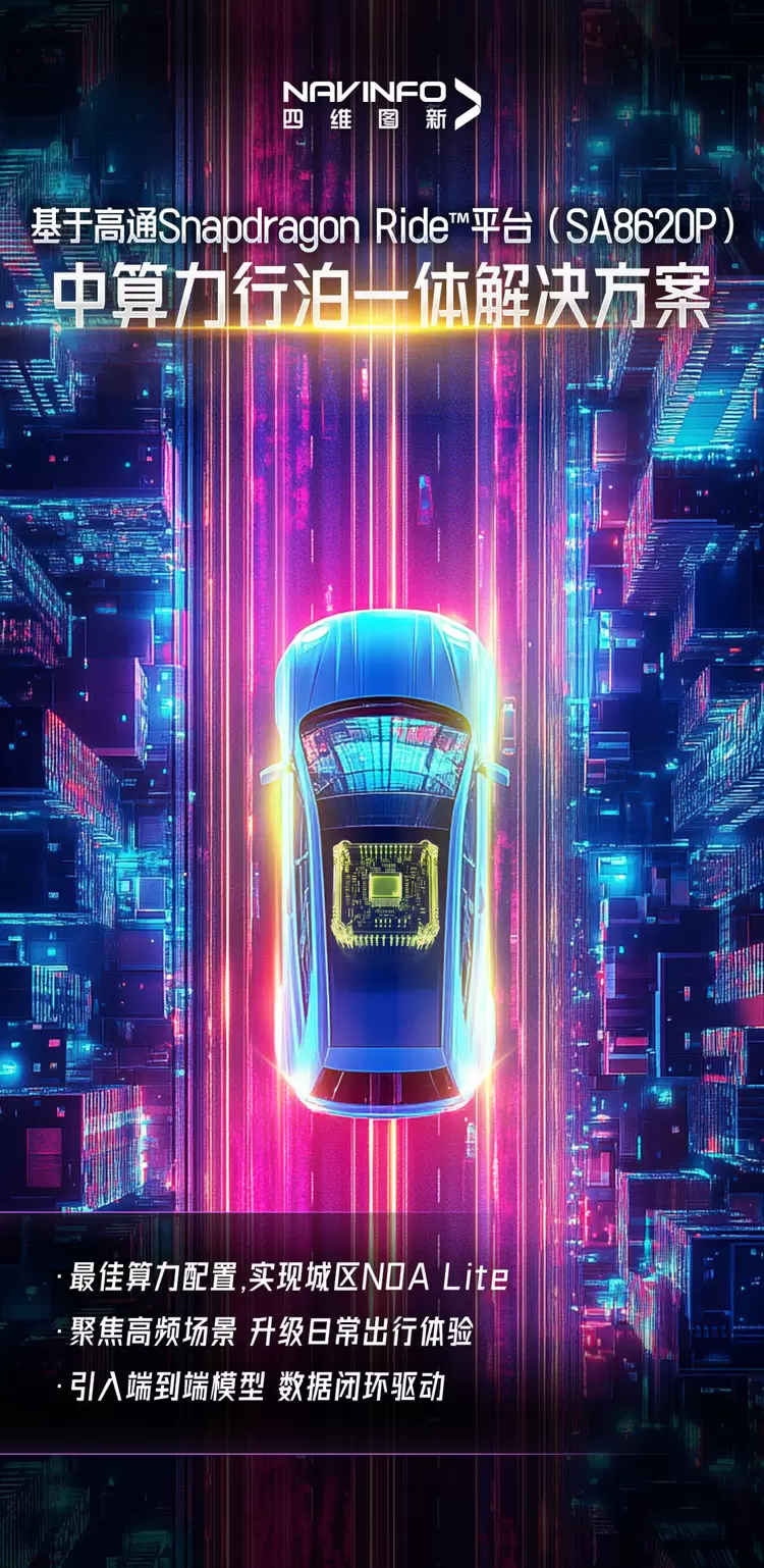在筑牢基本盘的同时,四维图新在本届车展推出多款面向中高阶市场的产品。其中,四维图新依托高通Snapdragon Ride™平台(SA8620P)的异构计算架构和高性能表现,以最佳算力配置实现轻量化城市领航辅助驾驶功能(城市NOA Lite)在内的行泊一体方案。据公开资料显示,在当前车载芯片算力梯队中,高通SA8620P以4nm制程工艺实现了对竞品的降维打击,这种工艺优势直接转化为更强的性能表现:SA8620P可提供36TOPS稠密算力,能够将城市NOA Lite功能及记忆泊车等功能,渗透进15万级主流价位段车型。