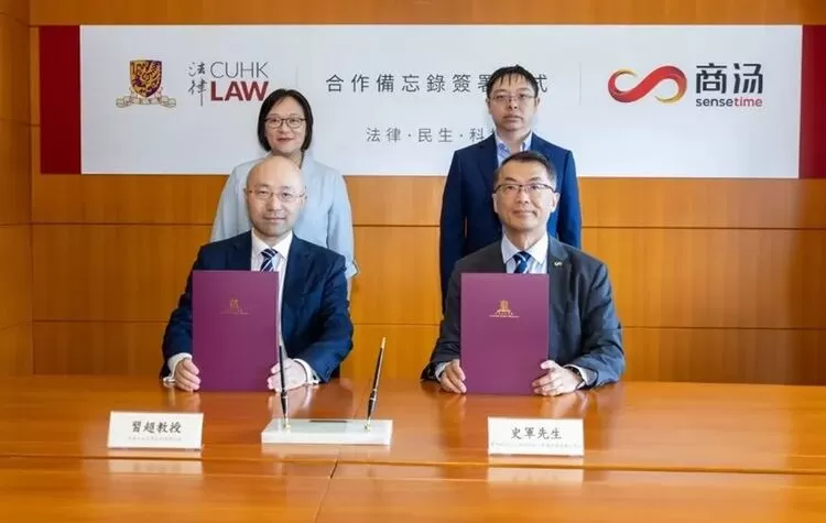 在香港中文大学常务副校长潘伟贤教授(后排左)、商汤科技联合创始人林达华博士(后排右)的见证下,香港中文大学法律学院院长习超教授(前排左)与商汤科技亚太业务总裁、集团战略规划副总裁史军先生(前排右)签署合作备忘录