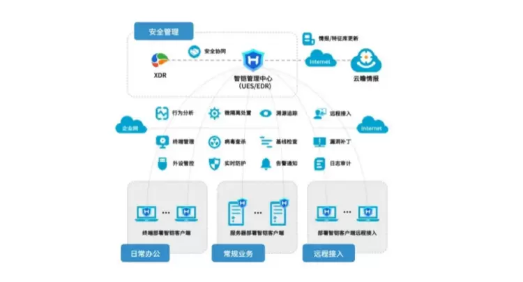 山石网科智铠统一终端安全管理系统可提供资产梳理、病毒查杀、实时防护、基线检查、漏洞补丁、外设管控、行为分析、流量可视等功能,帮助用户全面管理已知和未知风险,同时深入贯彻“零信任”的安全理念,通过与零信任安全网关的联动,在安全接入方面实现了终端安全接入内网。在业务访问层面,智铠基于流量模型自动生成微隔离策略,实现最小颗粒度的访问权限管理,助力用户建立可信任的终端网络环境。