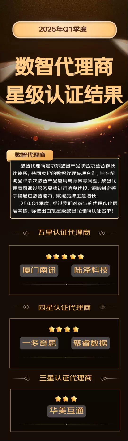 其中,数智代理商作为京东数智产品联合京营合作伙伴体系,共同发起的数智代理专项合作,可在通过京东考核后获得星级认证,以便更好地承接品牌消息代投、策略制定等需求。日前,京东也公布了首批星级数智代理商认证名单,他们通过帮助品牌解决数智产品应用与服务等问题,为品牌创造了业绩增长的新机会。