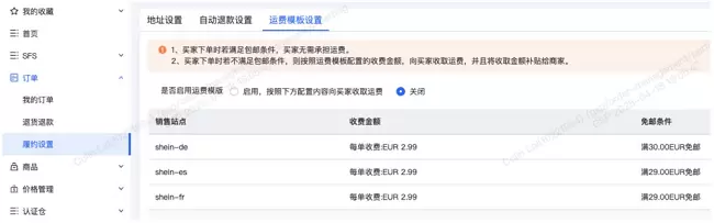 注:刚上线时,该功能是默认关闭的,大家根据需求手动开启。选择【启用】后,按照下方配置内容向买家收取运费 。开启后 3 - 5 分钟,免邮条件就会在前台显示。不过目前暂不支持咱们自行设置免邮条件或收费金额哦。