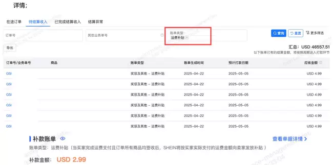 方法二:进入【卖家中心】 - 【财务】 - 【我的收入】 - 【待结算收入】,在【账单类型】筛选【运费补贴】,查看对应订单的账单详情。