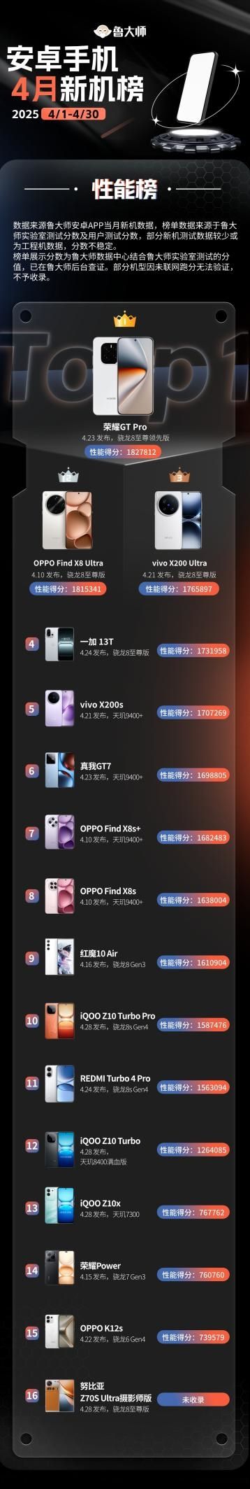 荣耀GT Pro以1827812的超高性能分数空降性能榜冠军,成为本月性能黑马。其首发的骁龙8至尊领先版无疑是它的利器,相较8至尊,Oryon超大核频率由4.32GHz提升至4.47GHz,GPU频率也从1100MHz升高到1200MHz,同时存储规格也是目前最高的LPDDR5X Ultra+UFS 4.1组合,如此性能铁三角拿下4月性能榜第一的确实至名归。