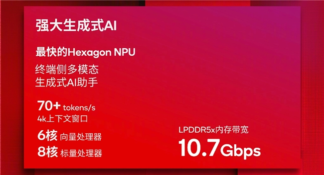 关于骁龙8至尊版AI性能,鲁SIr在此前月报中,已介绍过多次,Qualcomm Hexagon NPU架构升级,向量加速器核心增加到6个,标量加速器核心增加到8个,这使得其在处理复杂AI任务时的吞吐量和效率大幅提升,支持更长的Token输入(70+ tokens/s),能够更好地应对生成式AI和大语言模型的需求。8至尊整体AI性能提升45%,单位功耗性能提升同为45%。
