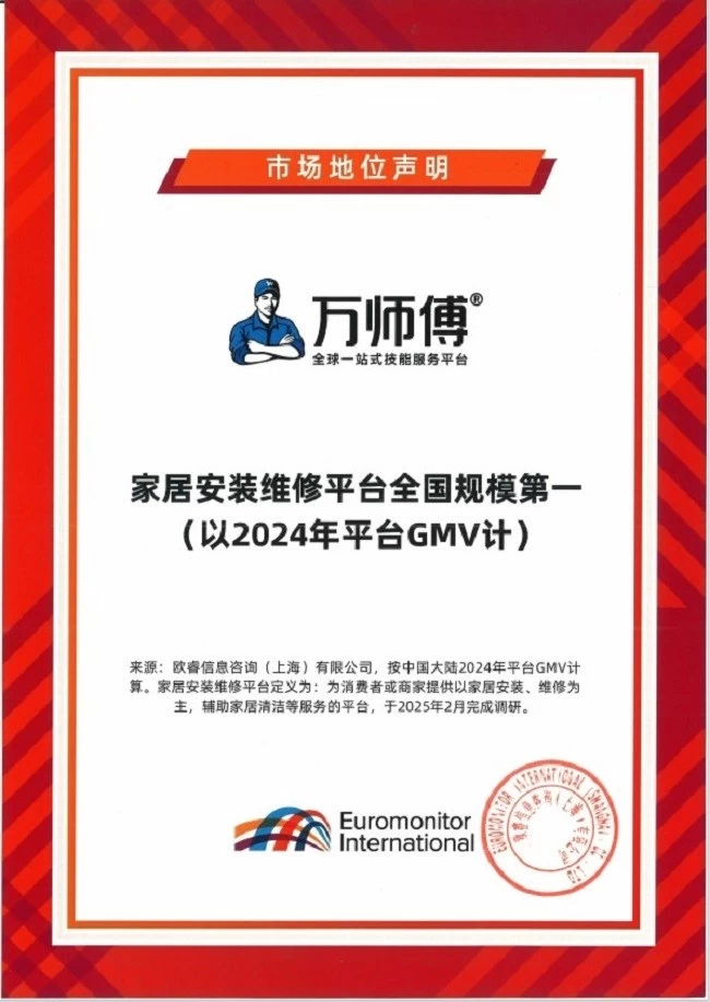 近日,国际权威机构欧睿咨询发布市场地位声明:万师傅系家居安装维修平台全国规模第一(以2024年平台GMV计*),即全国市占率第一。