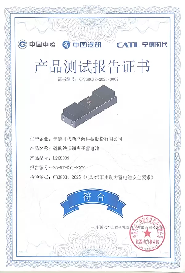 2025年5月7日,宁德时代天行B-客车系列、天行H-重型商用车系列与天行L-轻型商用车系列电池包分别在招商车研、中国汽研、上海机动车检测中心等权威第三方检测机构通过GB 38031-2025《电动汽车用动力蓄电池安全要求》(以下简称“新国标”)检测,成为国内首批满足该标准的商用动力电池,为商用车市场树立高安全标准新标杆。