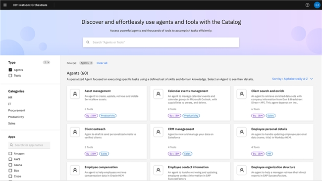IBM 针对特定业务领域打造的预构建智能体,可提供特定的专业知识和技能,助力企业提高生产力。首批推出的特定领域智能体包括: