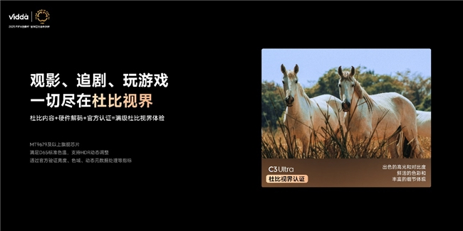 Vidda C3系列拥有杜比视界、HDR10+、IMAX、电影制作人模式等专业影院画质认证,足以证明其同级画质天花板的实力。杜比实验室商业合作部全球副总裁Javier Foncillas表示:“通过杜比视界,Vidda C3系列将为用户带来令人惊艳的视觉体验。你可以在喜爱的娱乐内容中,感受到更绚丽的色彩、更鲜明的对比度和更丰富的细节。预祝海信Vidda C3系列大获成功!”