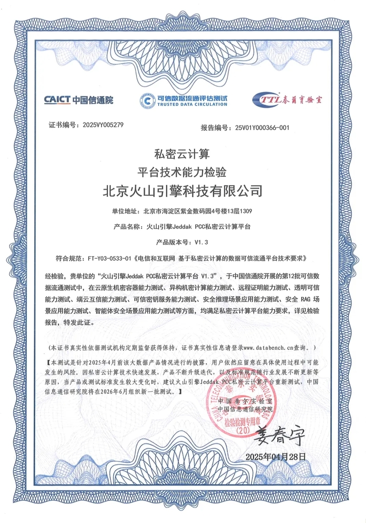 值得一提的是,近日,火山引擎 Jeddak PCC通过了中国信通院的可信数据流通测评,是国内 PCC 领域的首个测评证书,在端云互信能力、透明可信等9个方面均满足私密云计算平台能力要求。