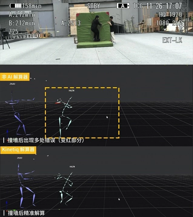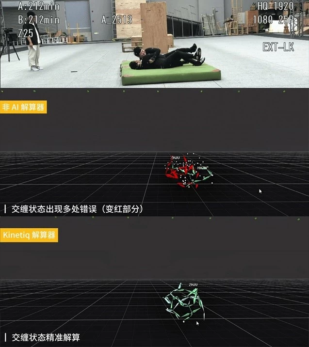 比如动捕演员在做复杂动作或多人交互表演时,标记点几乎不可避免地贴近甚至在镜头里“重合”或被遮挡,没有配备“AI大脑”的传统流程无法应付这类场景,只能生成凝滞甚至乱晃的错误解算动画,必须依靠人力进行修复和矫正。