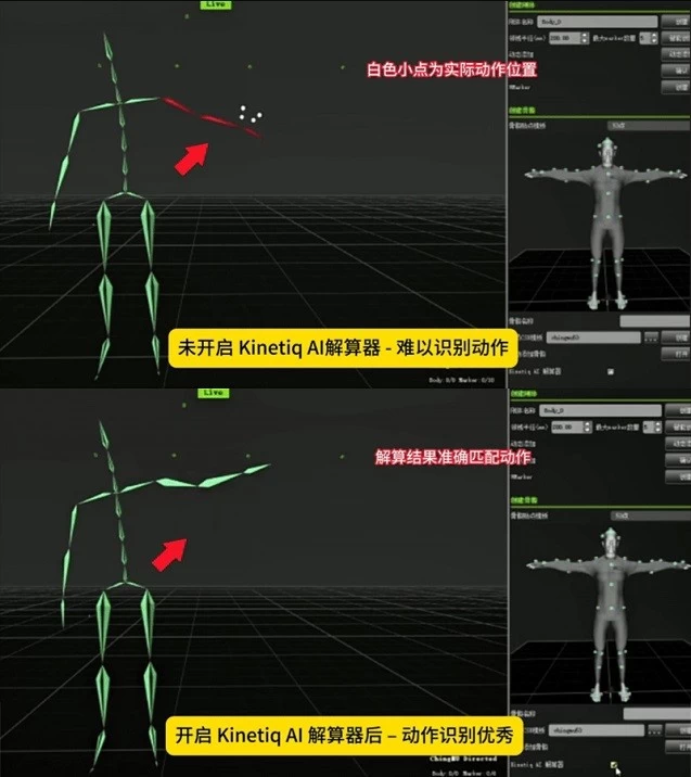 可以看出,相较CMAvatar2.0,Kinetiq AI解算器加持的CMAvatar3.0能够很好地处理marker标记点不准确甚至错误的情况。