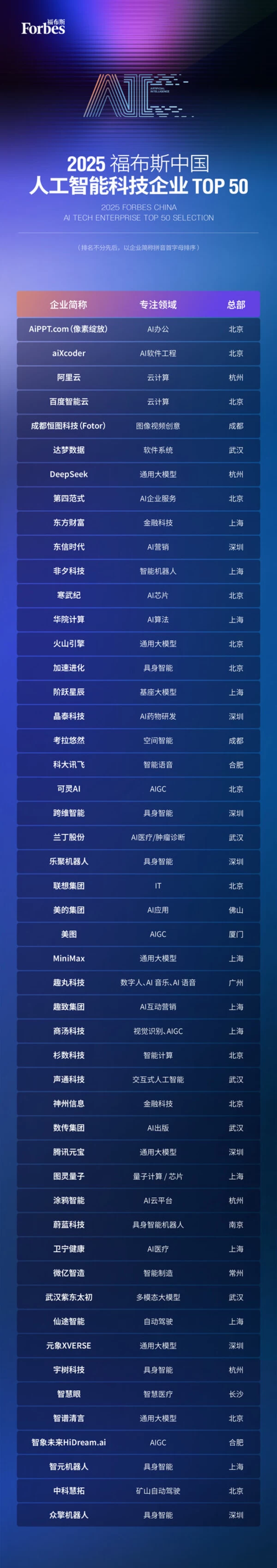 以下为"2025福布斯中国人工智能科技企业TOP 50评选"结果: