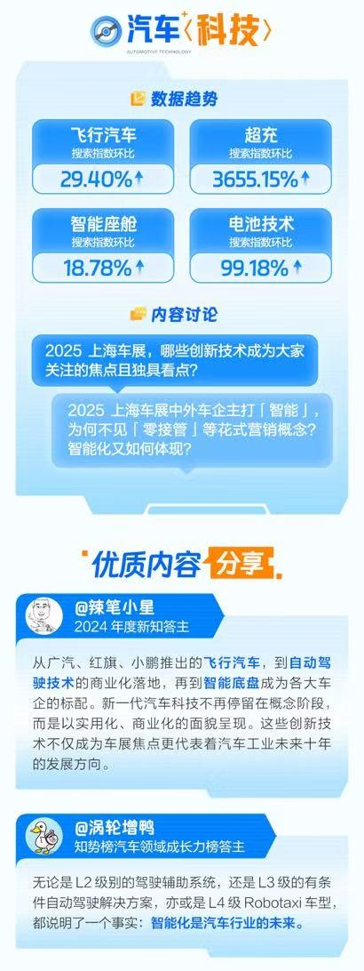 随着上海车展在五一假期的落幕,近日,知乎与“汽车测评国家队”中汽测评共同发布了《2025上海车展洞察报告》,报告显示,超充搜索指数环比上涨3655.15%,此外“新能源车值得买吗”,“电池技术”以及“飞行汽车“搜索指数环比上涨数据分别为292%、99.18%和29.40%,这代表着汽车前沿科技依然受到消费者关注,也预示着汽车工业未来的发展方向。
