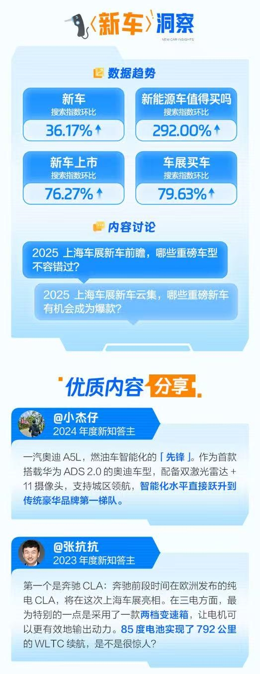 洞察报告数据显示,“新能源车值得买吗”搜索指数环比远远高于“新车上市”、“车展买车”等关键词。在知乎站内,“2025上海车车展新车云集,哪些重磅新车有机会成为爆款”受到答主们热议,2023年度新知答主张抗抗表示,奔驰CLA以85度电池实现了792公里的WLTC续航,惊喜满满。知乎答主“jasoncheng”则认为,拥有独立的原创设计+独一档补能体系的乐道L90拥有爆款潜质。