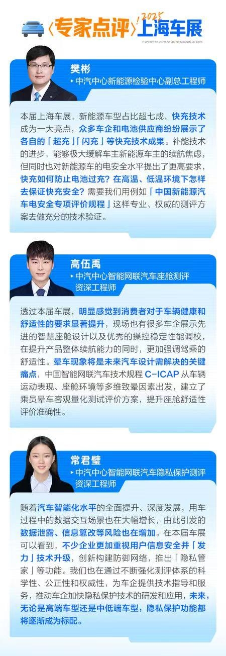 中汽中心新能源检验中心副总工程师樊彬表示,快充技术是本届上海车展亮点,“将快充技术与电池技术结合,在低温环境下做到‘去里程焦虑化’需要我们像‘中国新能源汽车电安全专项评价规程’这样专业、权威的测评方案去做充分的技术验证”。