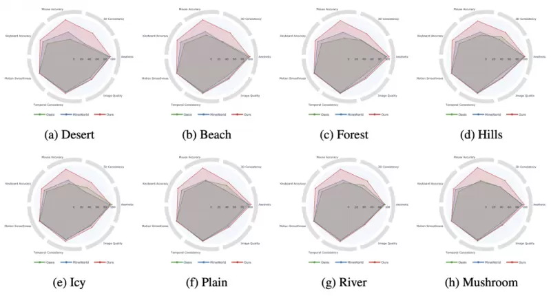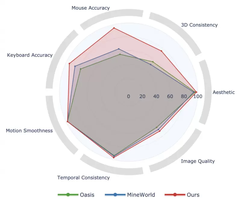 在GameWorld Score评测系统中,Matrix-Game在视觉质量、时间一致性、动作可控性与物理规则理解四大维度上均取得领先成绩,全面超越现有开源基线模型 Oasis 与 MineWorld。