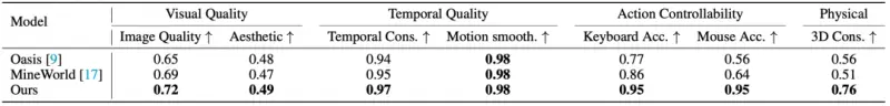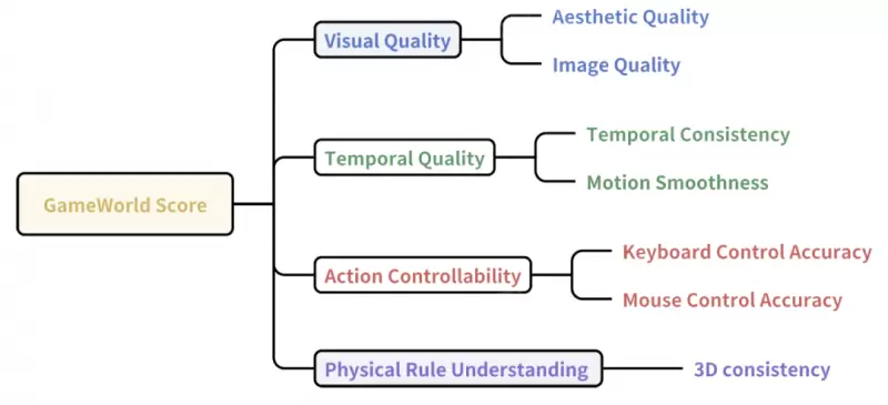 3.GameWorld Score评测体系:提出统一的游戏交互世界评估标准,从视频的视觉质量、时序质量、动作可控性与物理规则理解四个维度,全面量化模型性能,填补了该领域缺乏系统性评测基准的空白。