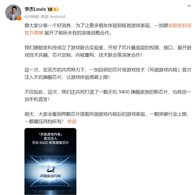 一加中国区总裁李杰表示,“在双方的共同努力下,一加自研的芯片级游戏技术「风驰游戏内核」首次注入天玑旗舰芯片,让游戏体验再破上限!明天,大家会看到两颗芯片的游戏表现,一颗突破行业上限,一颗碾压同档所有!