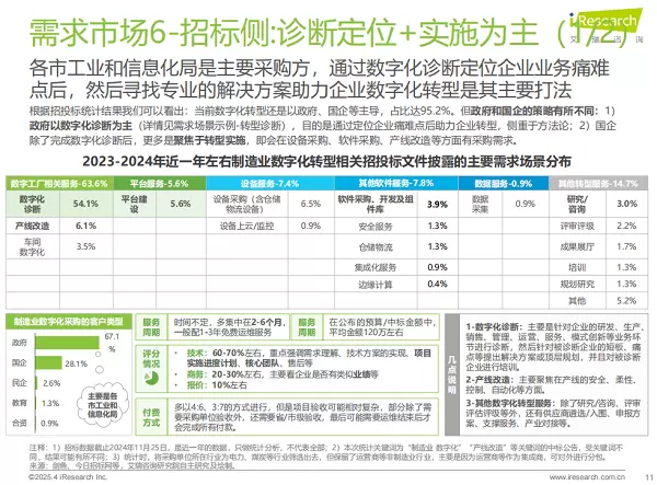 1 )地域特色明显,广东、江苏、浙江、山东既是制造业大省,也是积极尝试转型的省份,产业 / 区域协同发展、提升数字化转型的 基础支撑能力基本是其共性举措; 2 )从需求场景来看,评优和招标市场有所区别:评优侧更关注生产制造相关环节的具体落地操作;招标侧则多由各市工业和信息化局采购的,希望通过转型诊断后找到企业在研发、生产作业、数据、组织战略等环节开展诊断工作,进而给出相应的改造建议,引导企业顺利转型。