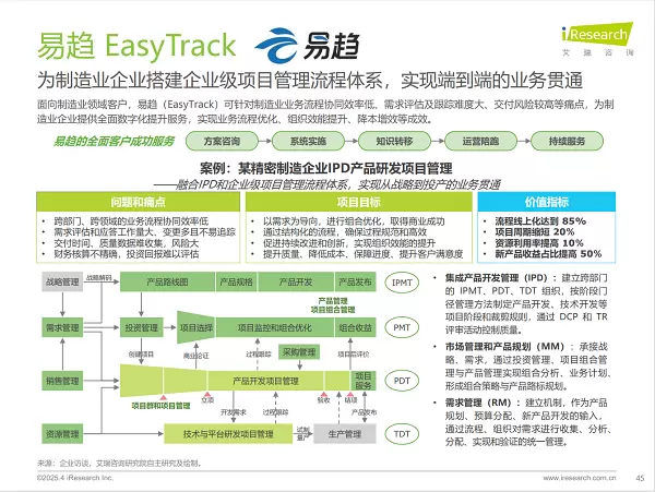 蓝云软件提供一站式项目数字化管理运营平台(易趋),支持产品研发、合同交付、企业变革和数字化等各种类型项目的全生命周期管理,帮助制造业企业优化业务流程、提升组织效能,如某精密制造企业IPD产品研发项目管理,实现了从战略到投产的业务贯通 。