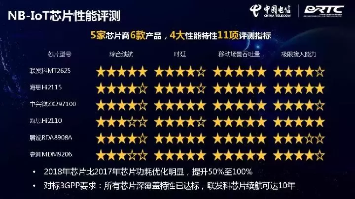 在《NB-IoT芯片评测报告》中,中国电信对联发科、华为海思、中兴微电子、紫光展锐和高通等5家芯片商,6款产品,4大性能特性,11项评测指标。结果显示,2018年芯片比2017年芯片功耗优化明显,提升50%至100%;对标3GPP要求:所有芯片深覆盖特性已达标,联发科芯片续航可达10年。