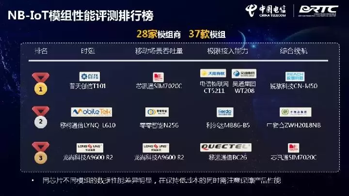 同时,中国电信还对28家模组商的37款模组进行了测试。结果显示,同芯片不同模组的数据性能差异明显,在保持低成本的同时需注意保障产品性能。
